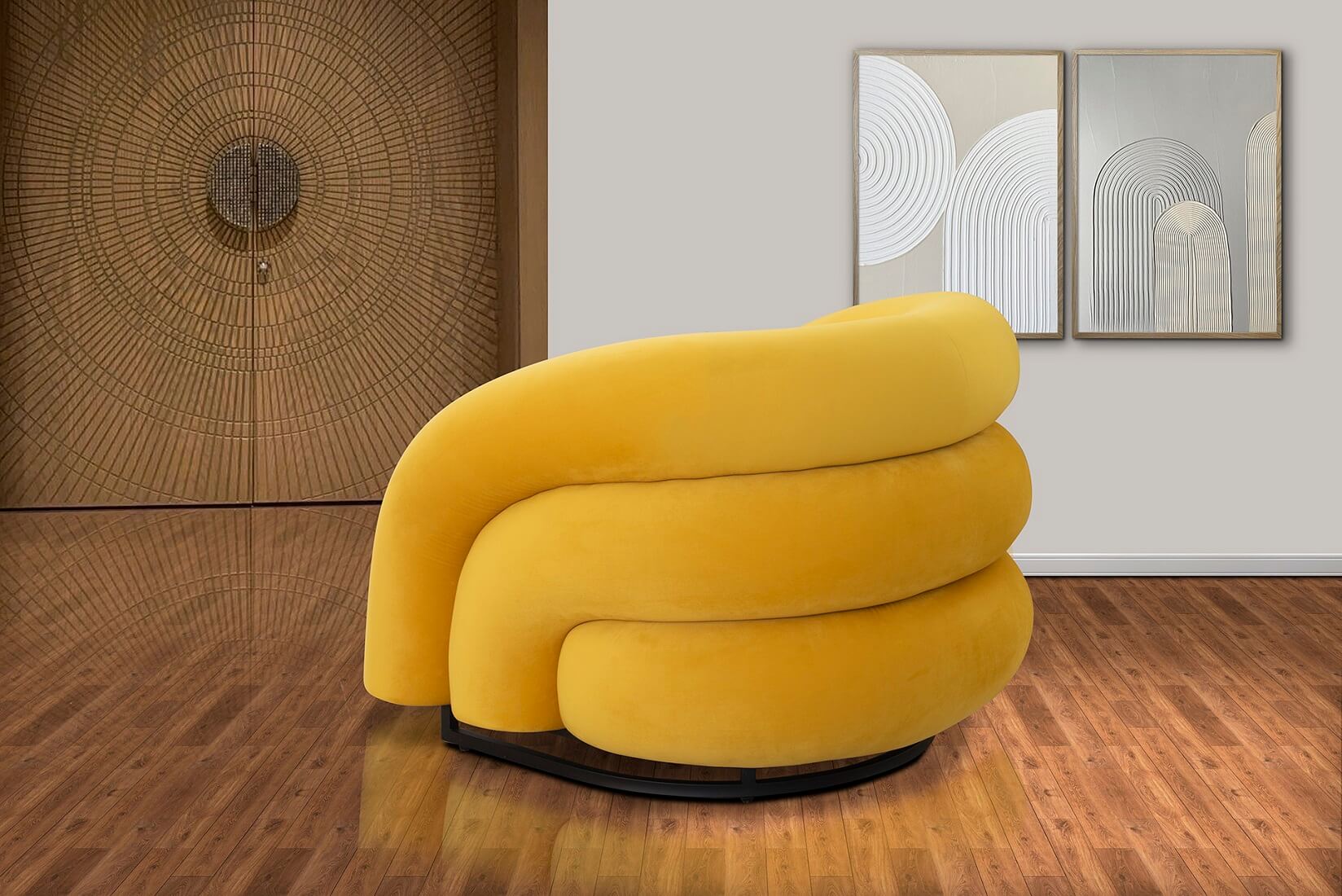 Ανανεώστε τον χώρο σας με την πολυθρόνα 0644 της Galanis InHouse σε λαμπερό κίτρινο βελούδο. Με τον εντυπωσιακό, καμπυλωτό σχεδιασμό της και την αναπαυτική της αίσθηση, μετατρέπει κάθε γωνιά σε σημείο χαλάρωσης και στυλ. Το έντονο χρώμα της δίνει ζωντάνια και θετική ενέργεια, ενώ η μοντέρνα γραμμή της προσθέτει πολυτέλεια και δυναμισμό στη διακόσμηση.