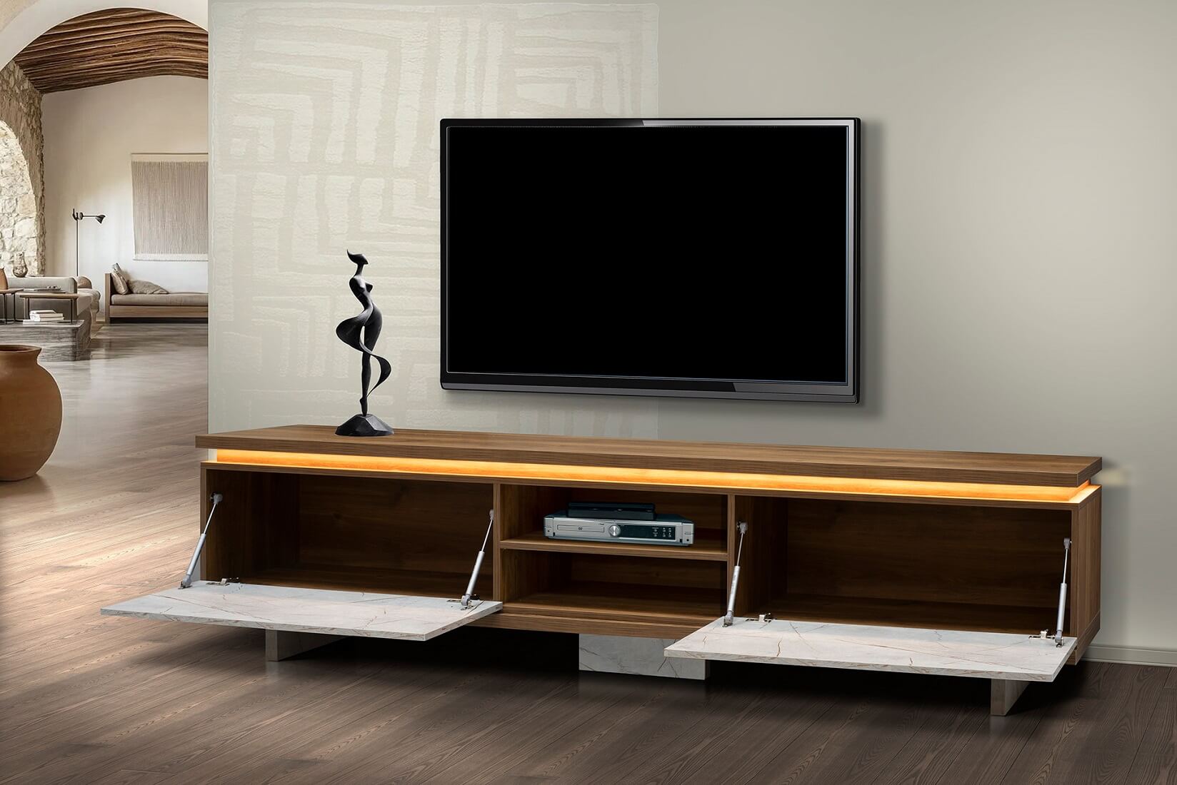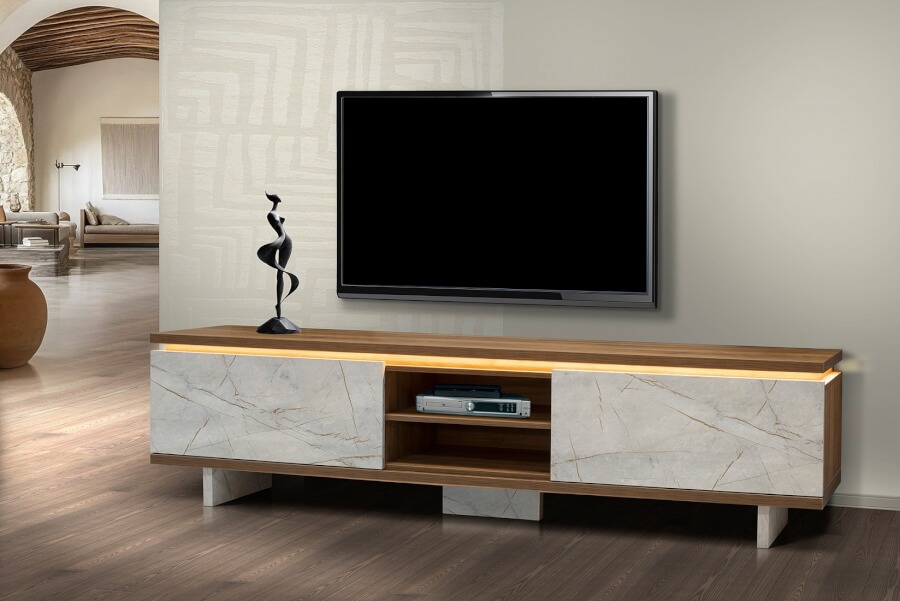 Ο συνδυασμός ξύλο και απομίμησης λευκού μαρμάρου δίνει μια αίσθηση minimal κομψότητας, ενώ ο κρυφός led φωτισμός δίνει την αίσθηση χαλάρωσης που χρειάζεσετε στο σαλόνι σας. Η τιμή αν προσθέσουμε τον φωτισμό led διαμορφώνεται στα 640euro.
