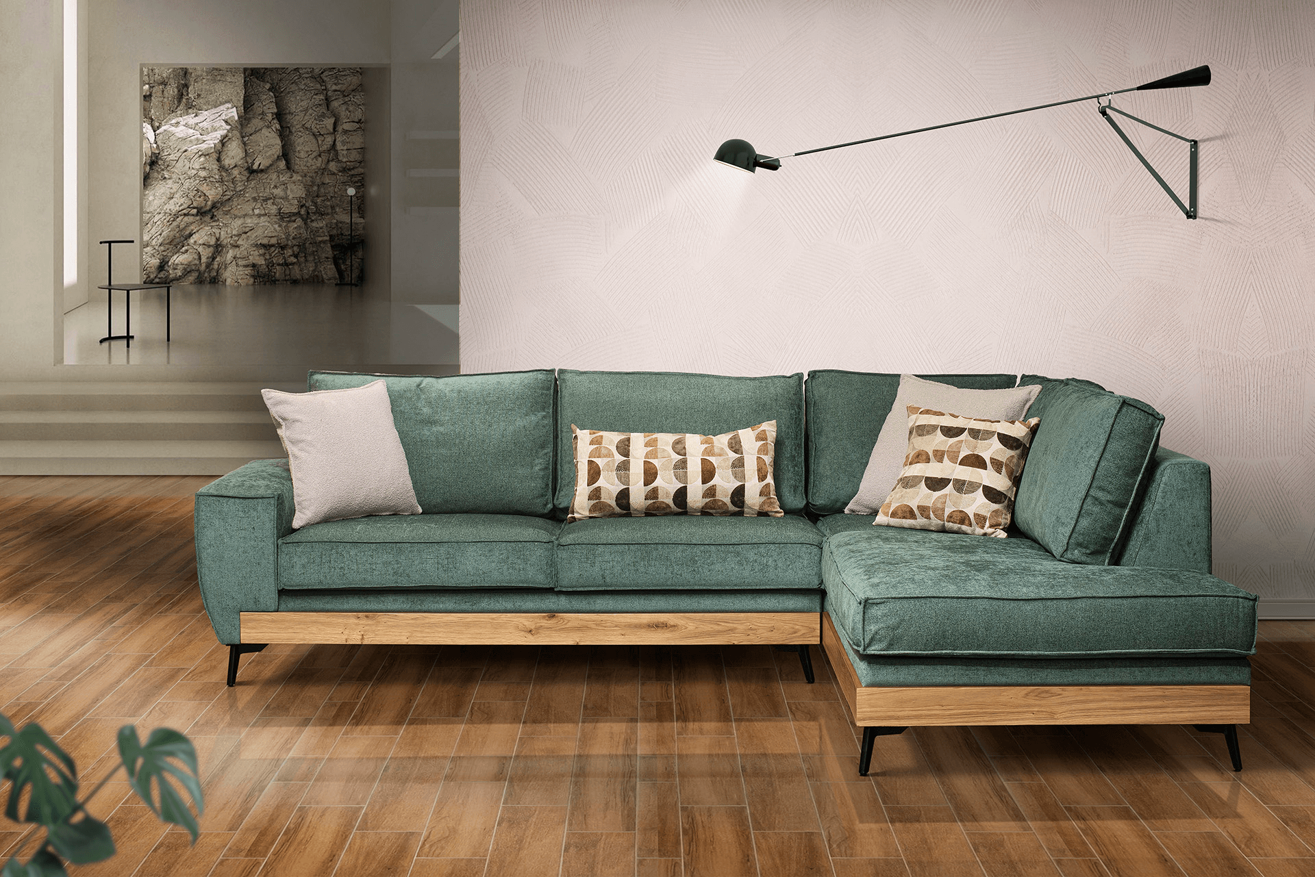 Ο γωνιακός καναπές Bari φέρνει στο σαλόνι σας μια αίσθηση ηρεμίας και μοντέρνας κομψότητας. Η απαλή απόχρωση μέντας σε συνδυασμό με τη φυσική βάση σε όψη ξύλου δημιουργεί ένα αποτέλεσμα φωτεινό, φιλόξενο και απόλυτα σύγχρονο.